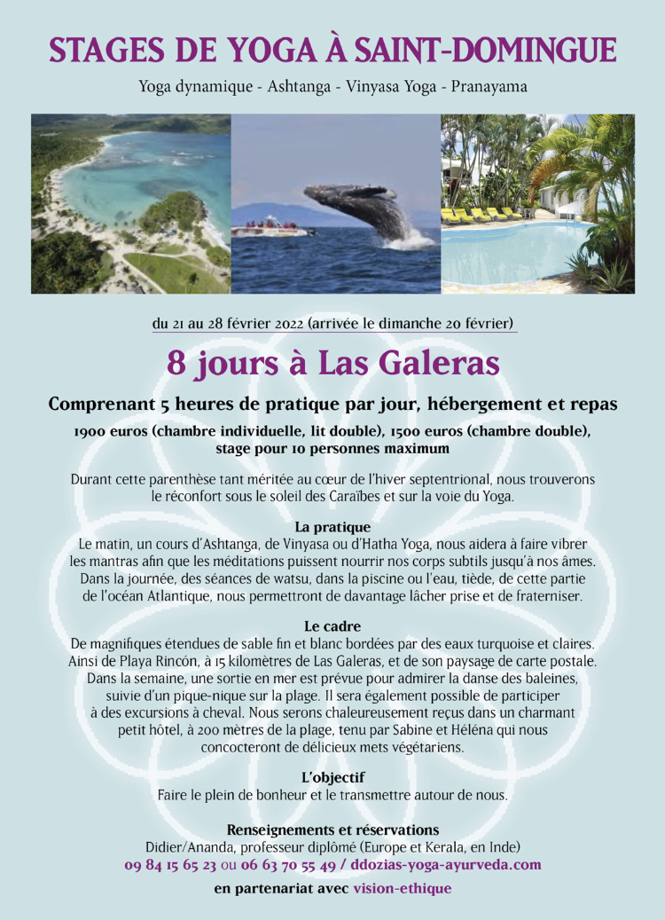 De magnifiques étendues de sable fin et blanc bordées par des eaux turquoise et claires. Ainsi de Playa Rincón, à 15 kilomètres de Las Galeras, et de son paysage de carte postale. Dans la semaine, une sortie en mer est prévue pour admirer la danse des baleines, suivie d’un pique-nique sur la plage. Il sera également possible de participerà des excursions à cheval. Nous serons chaleureusement reçus dans un charmant petit hôtel, à 200 mètres de la plage, tenu par Sabine et Héléna qui nous concocteront de délicieux mets végétariens.